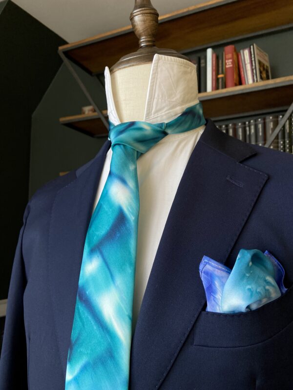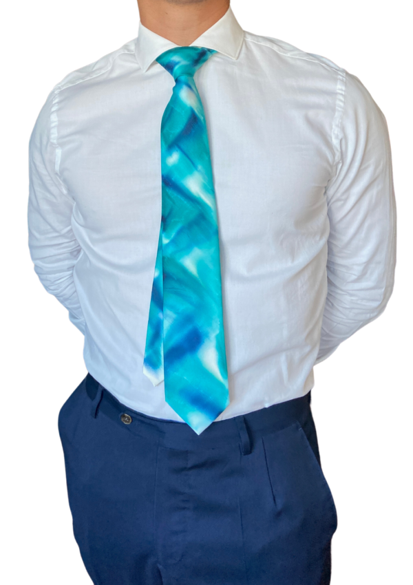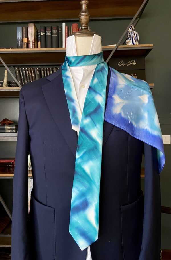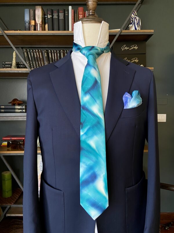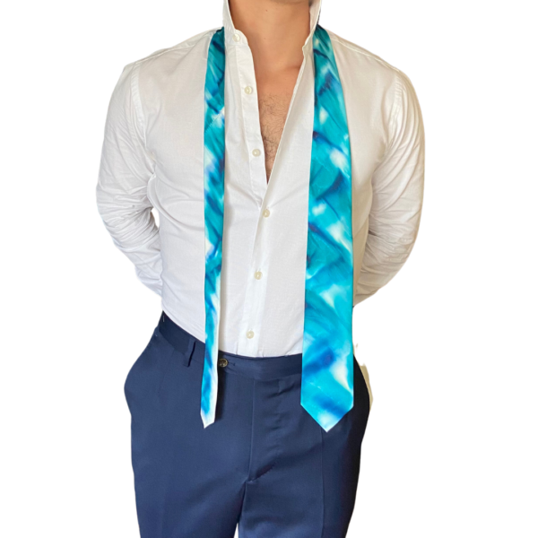 - Indulge in the unparalleled exclusivity of our “The Santorini” tie, meticulously hand-painted on luxurious 100% silk material by our skilled artist in Spain. This one-of-a-kind masterpiece ensures that you are the sole owner of a truly unique and distinctive accessory.